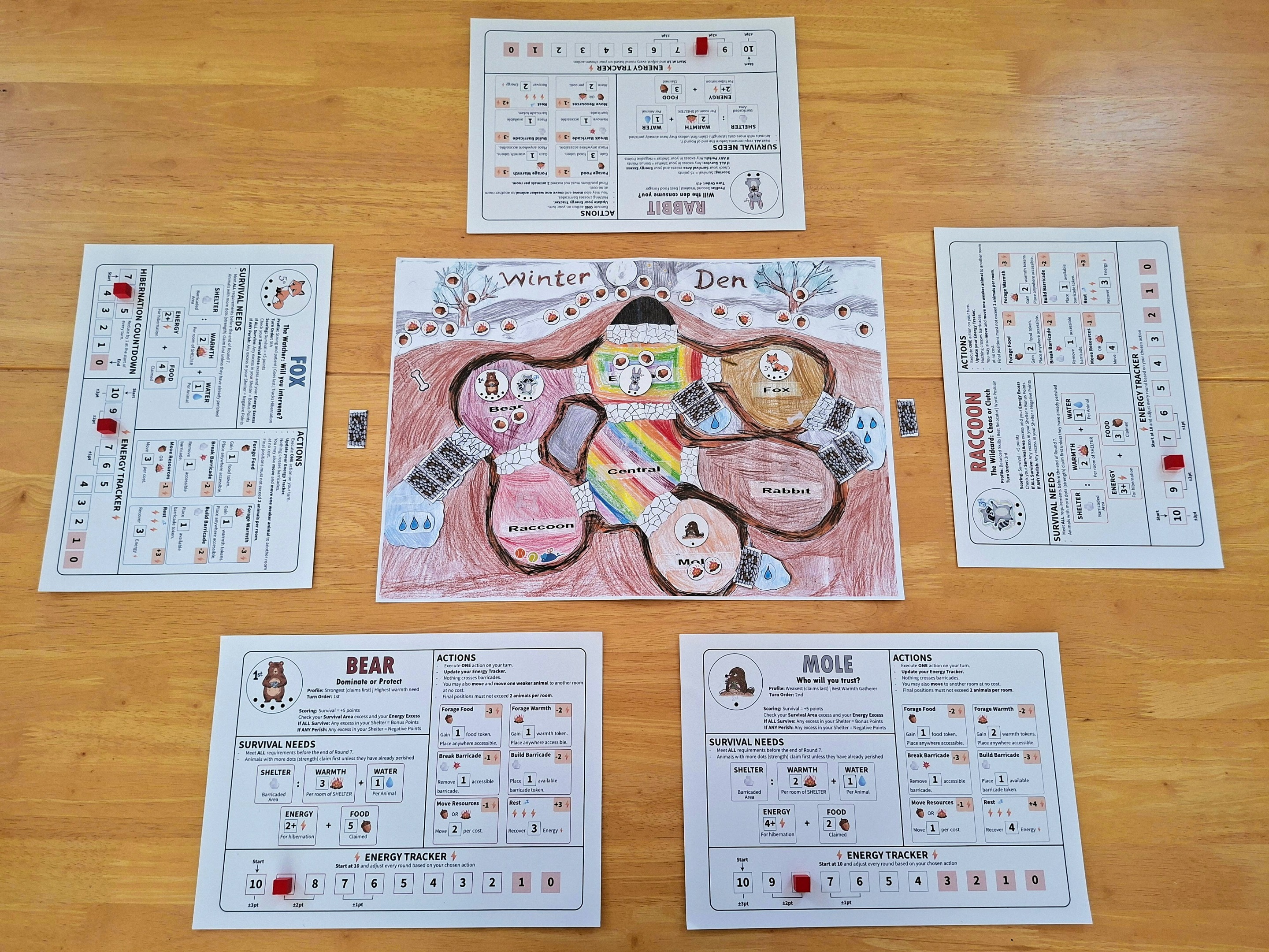 Winter Den takes five distinct animal personalities and gives them just seven days to prepare for winter. Every animal must secure food, warmth, water, shelter, and enough energy to survive hibernation. Every decision changes what is possible for everyone else.
